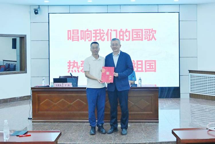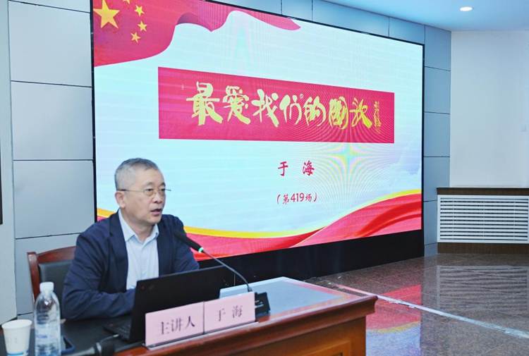 于海结合自身50余年与国歌相伴的深厚情愫为主线,从国歌的概述、《义勇军进行曲》发展历程、国歌崇高神圣至高无上、国歌是家国情怀教育的生动教材、我们的国歌是最好的国歌五个维度,用“理论解读+历史回溯+案例分享+现场视听”的方式,将国歌背后的时光印记娓娓道来,深刻阐释了国歌的艺术魅力和精神内涵,为广大师生讲授了一堂激荡爱国情怀、凝聚民族精神的思政大课。他号召广大师生学好唱好国歌、正确使用国歌、深入领会国歌,不断厚植爱国情怀、勇担时代使命、积极拼搏进取,以更加饱满、更加昂扬的精神状态,为传承和弘扬中华优秀传统文化贡献力量。讲座尾声,在于海老师的带领指挥下,全体师生肃立,共同唱响国歌,用歌声表达着对祖国的深深热爱和坚定信念。